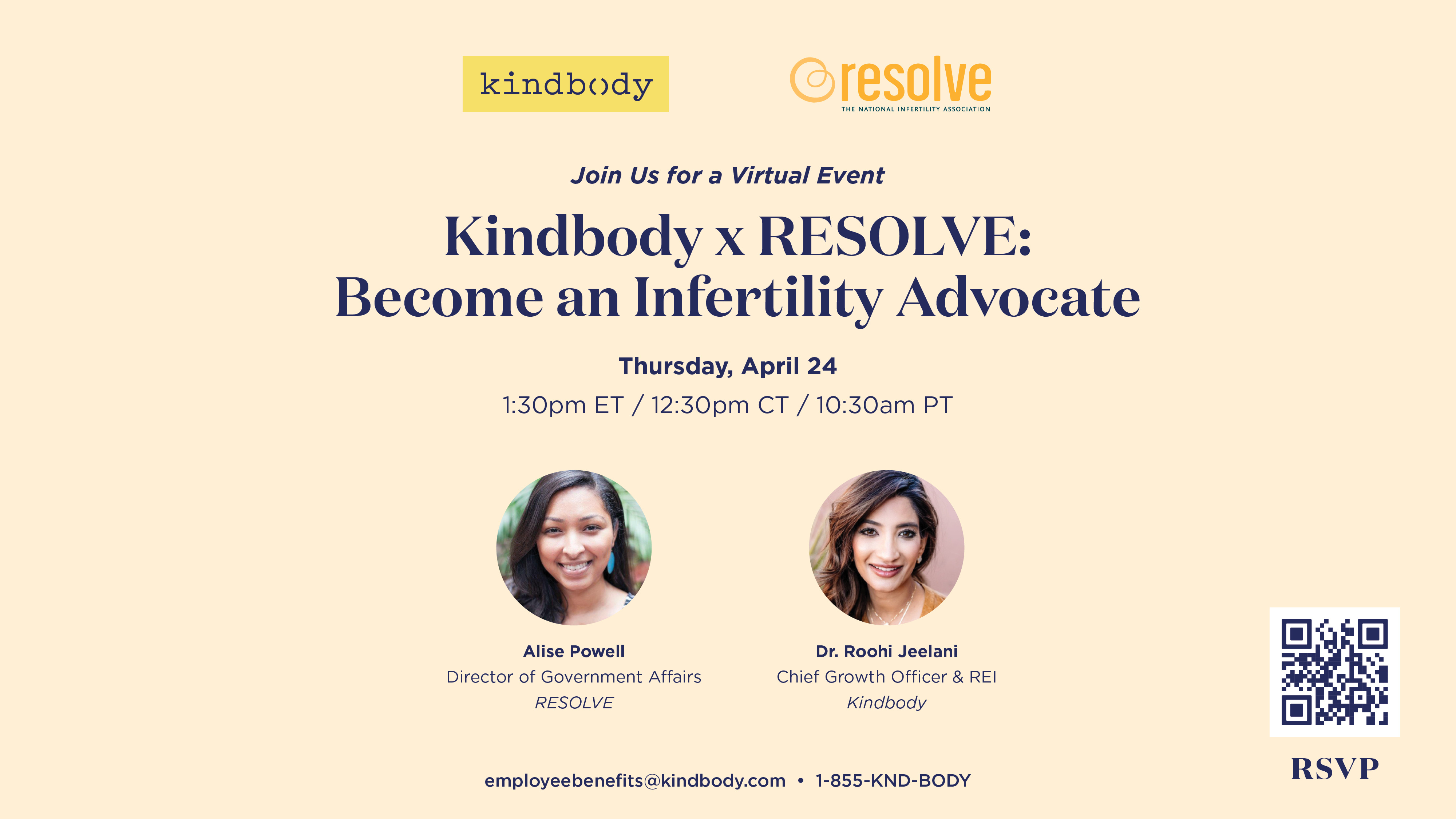 Invite your teams to our national webinar in your internal communications. Kindbody Live: Navigating the Realities of Infertility Thursday, April 23, 2026 at 4 PM ET Fertility challenges impact 1 in 6 individuals—yet many employees navigate this journey silently. Now is the time to elevate awareness and ensure your benefits truly meet the needs of your workforce.