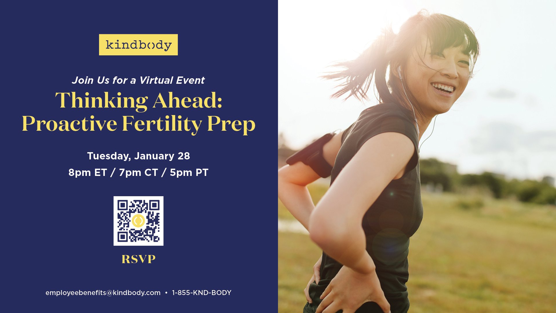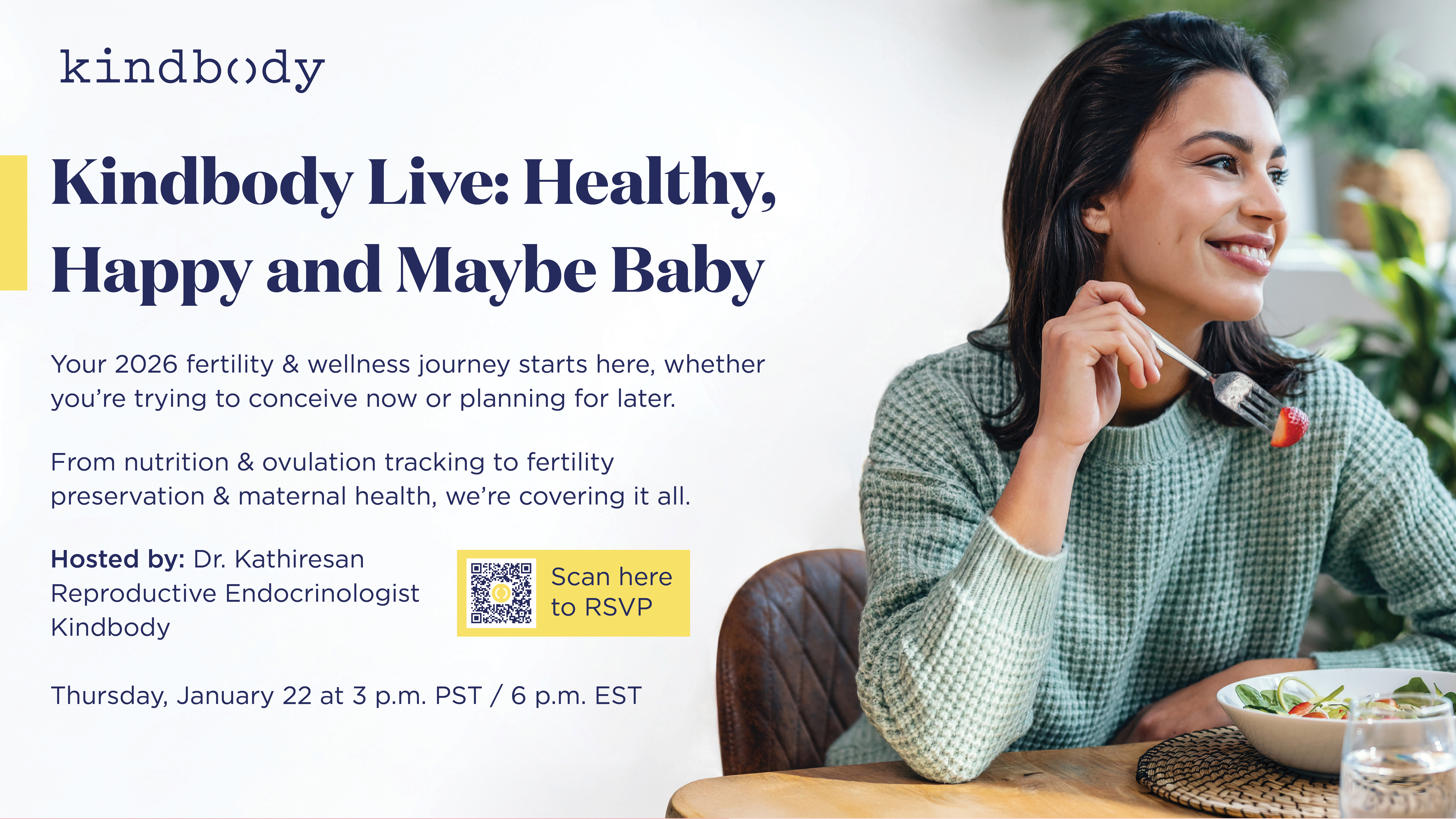 Written Content Templates Access short articles to help promote Kindbody benefits through your internal communication channels. Invite your teams to our national webinar in your internal communications. Kindbody Live: Healthy, Happy and Maybe Baby Thursday, January 22 at 3 p.m. PST / 6 p.m. EST