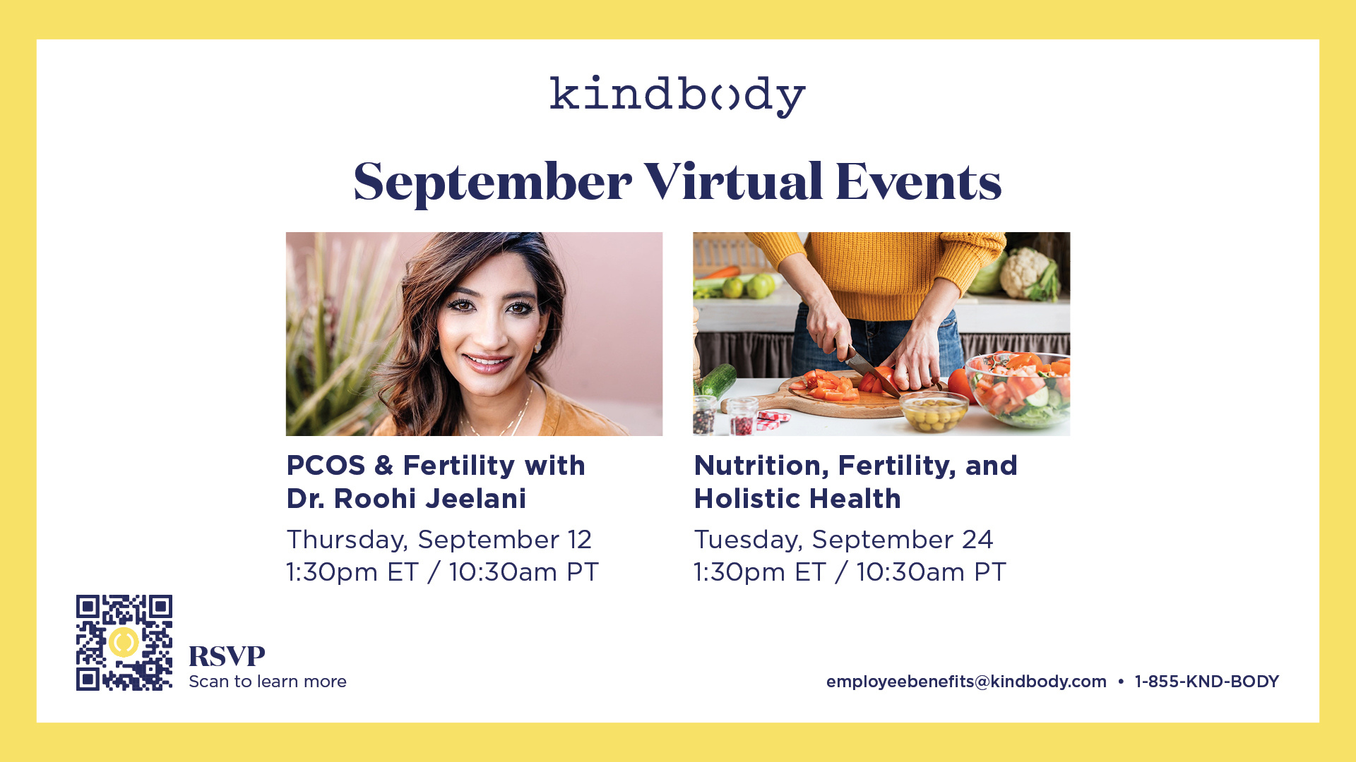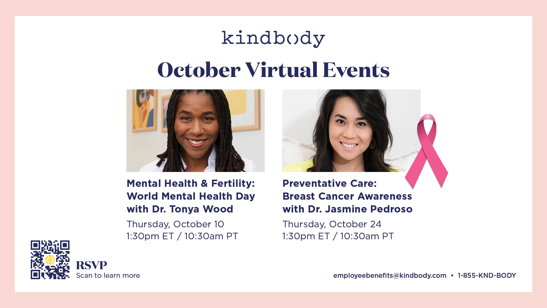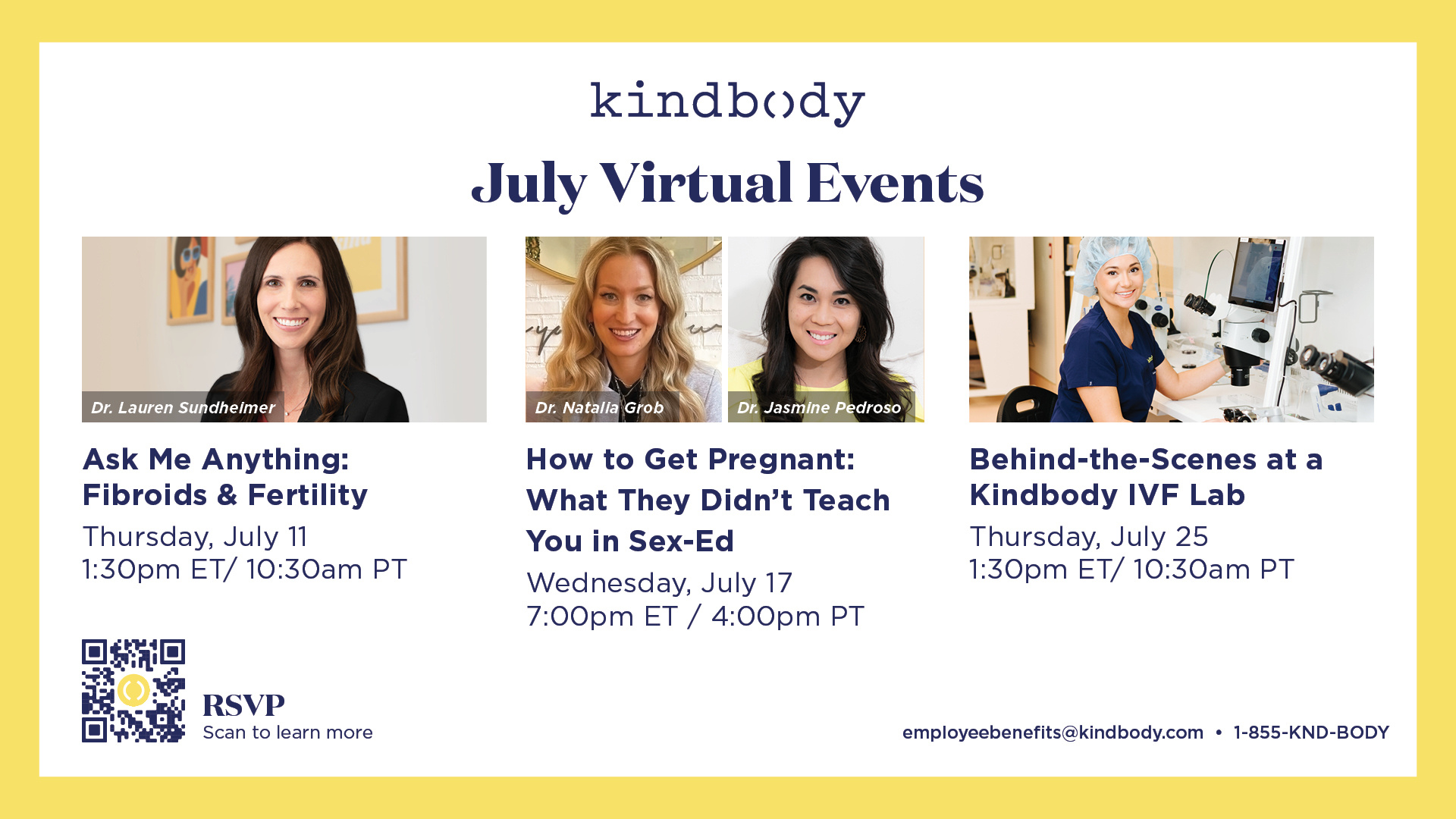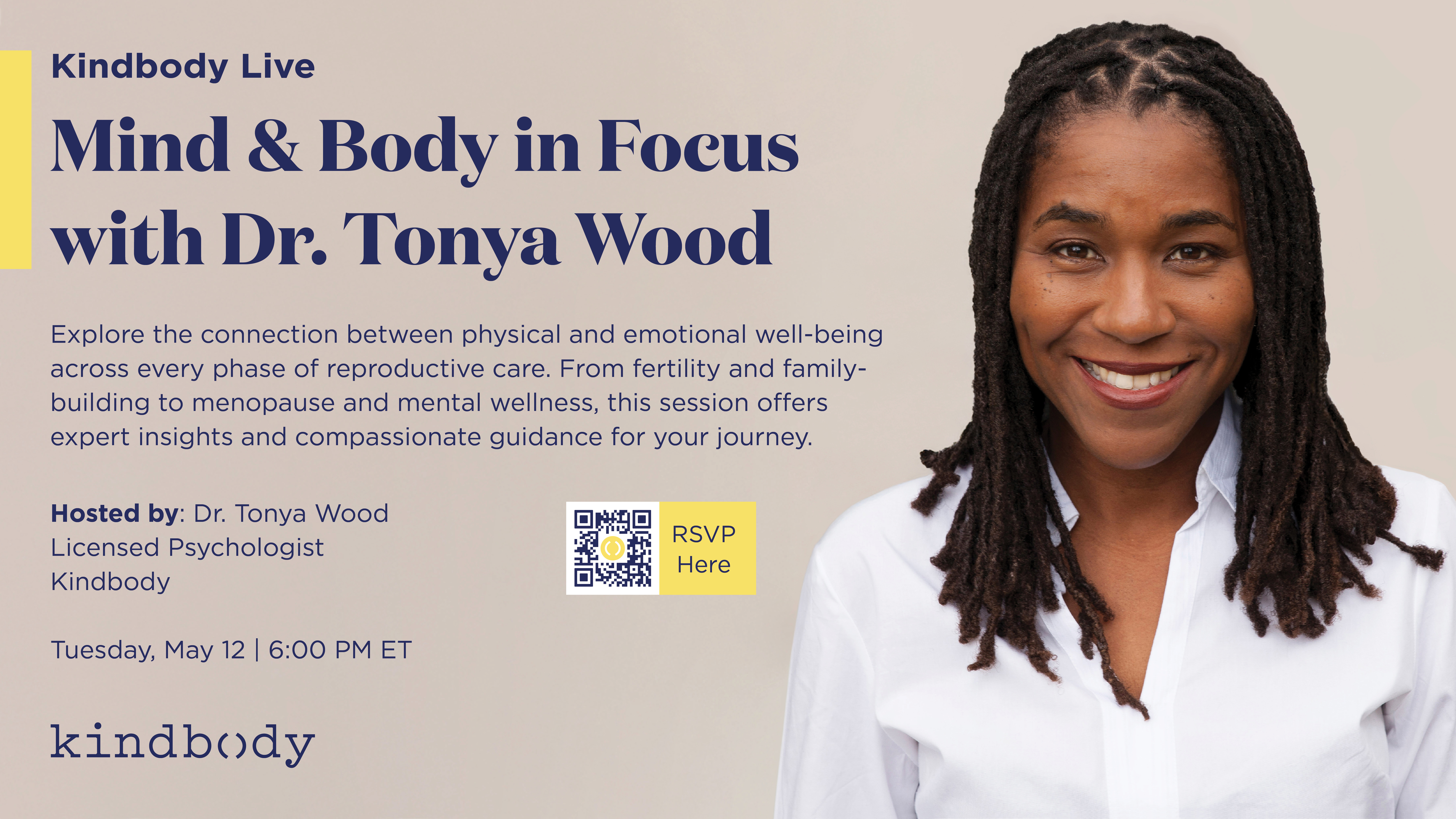 Invite your teams to our national webinar in your internal communications. Kindbody Live: Mind & Body in Focus with Dr. Tonya Wood Tuesday, May 12 | 6:00 PM ET