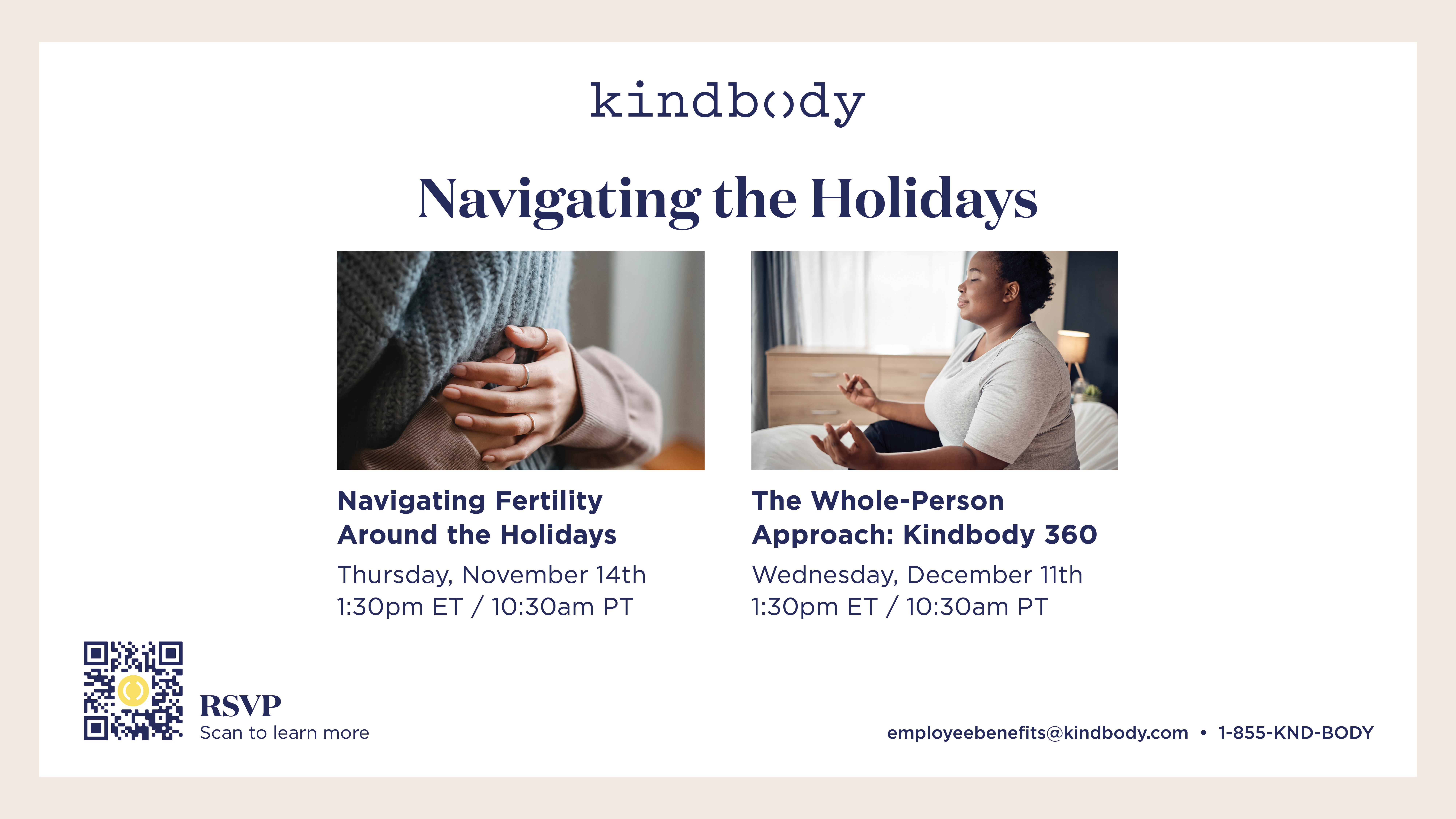 Written Content Templates Access short articles to help promote Kindbody benefits through your internal communication channels. December Virtual Event Invite your teams to our national webinar in your internal communications. Kindbody Live: Navigating the Holidays During Infertility Wednesday, December 17th at 3 p.m. PST / 6 p.m. EST